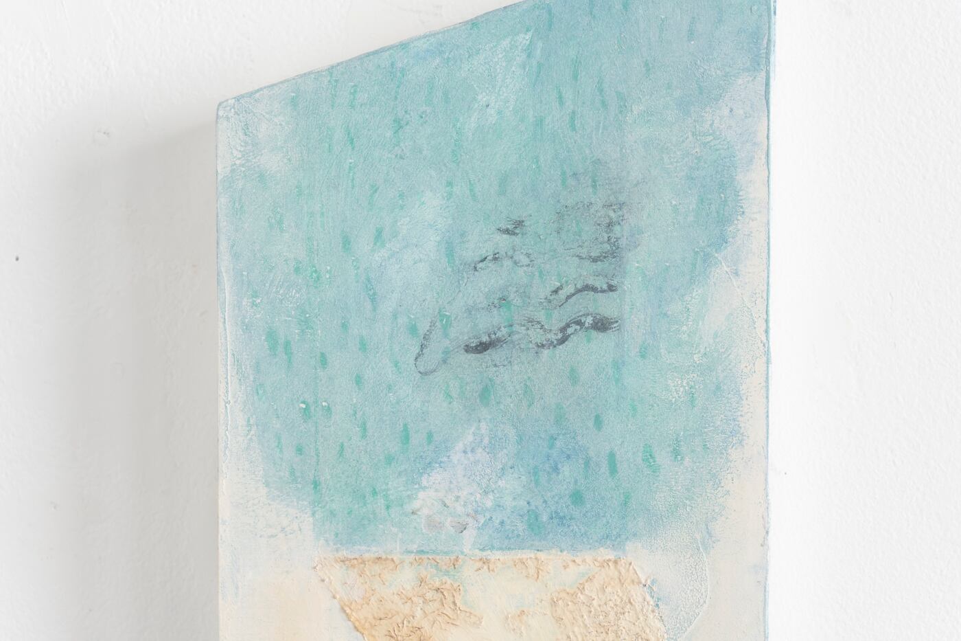 絵の具を置いては拭い、削り、また置く、その反復の中に、やがて形のない何かが現れてくるのを待つ。何気ない顔をしていないと現れてこない、直視しようとすると消える星のような「それ」を、知覚せずただ拾うように探しています。