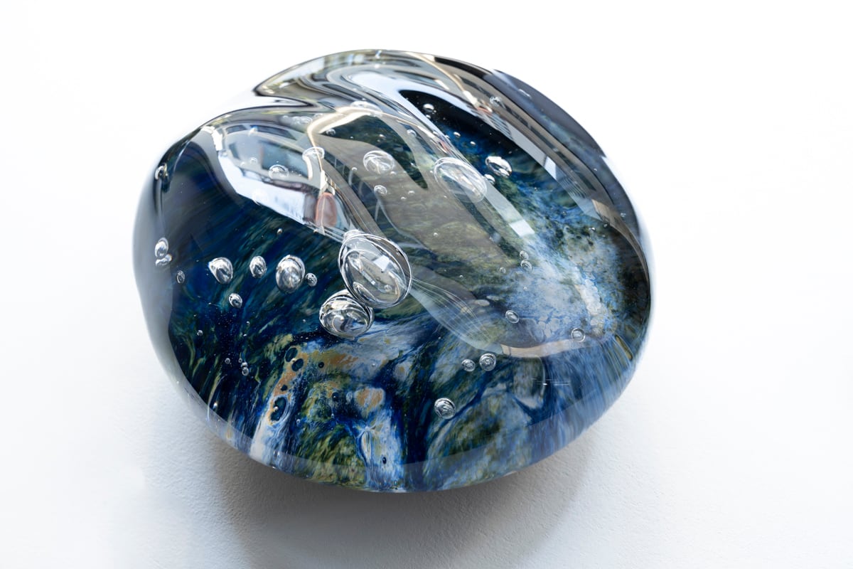 独自の技法により生み出したガラスの模様も、色ガラスの種類や混ぜ具合、熱の加減によって、一つ一つが違う表情を浮かび上がらせます。