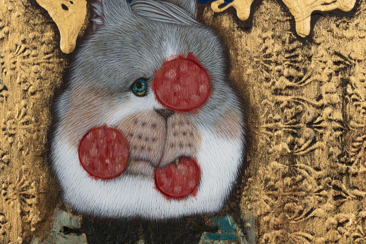 <視覚で触る>をテーマに生き物の肖像を制作をしています。事物のミクロの単位や成り立ちに興味を持つ性質であるため、毛皮を描きたいという欲求は自然と地肌の色に固有色で毛を一本一本描くというスタイルにつながりました。生き物を描く中で今回テーマに選んだのは「食べ物」です。食べることは生きること。でも実際の生活の中では健康や社会性、命の重みなど様々な理由で制約が頭をよぎると思います。苦しくもあり、楽しくも可愛らしくもある、それぞれの食べ物への葛藤をご覧ください。